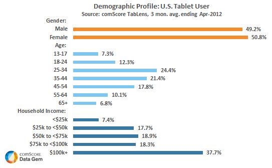 Tablet users also skewed towards upper income households, likely a function of the high price point of these devices still considered a luxury good to many consumers. Nearly 3 in 5 tablet users resided in households with income of $75,000 or greater.”