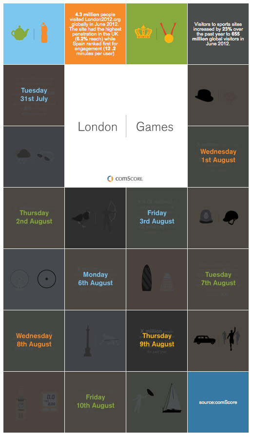 Here is an opportunity you should take advantage of. Data mining and sifter comScore is providing free data snacks around the Games, to keep the industry up-to-date. Check back every day for an updated graphic showing global online and mobile behavioural patterns and how these might be affected by one of the biggest sporting events in the world. Click on the image below for more info and to sign up.