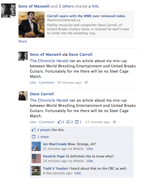 It all started a couple of days ago when Carroll received an email from Google notifying him that it was temporarily taking down the first of his three United Breaks Guitars videos because of a claim by World Wrestling Entertainment that it was an infringement of its brand or copyright.